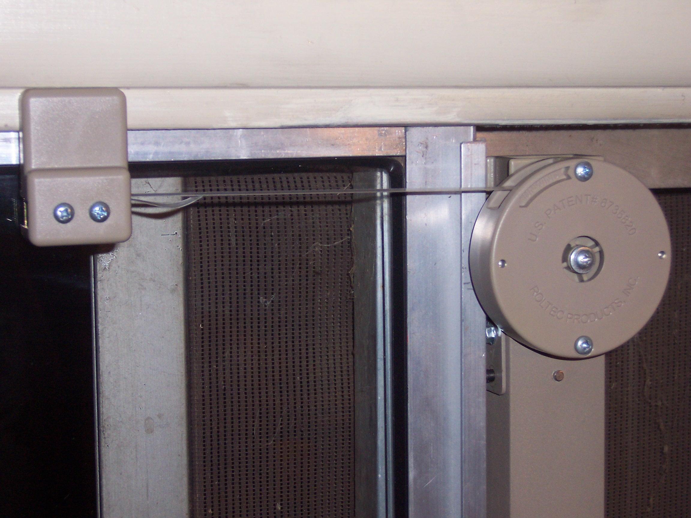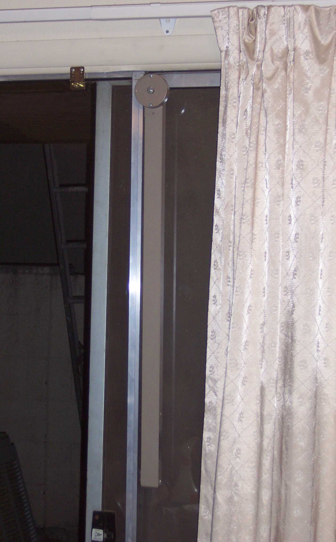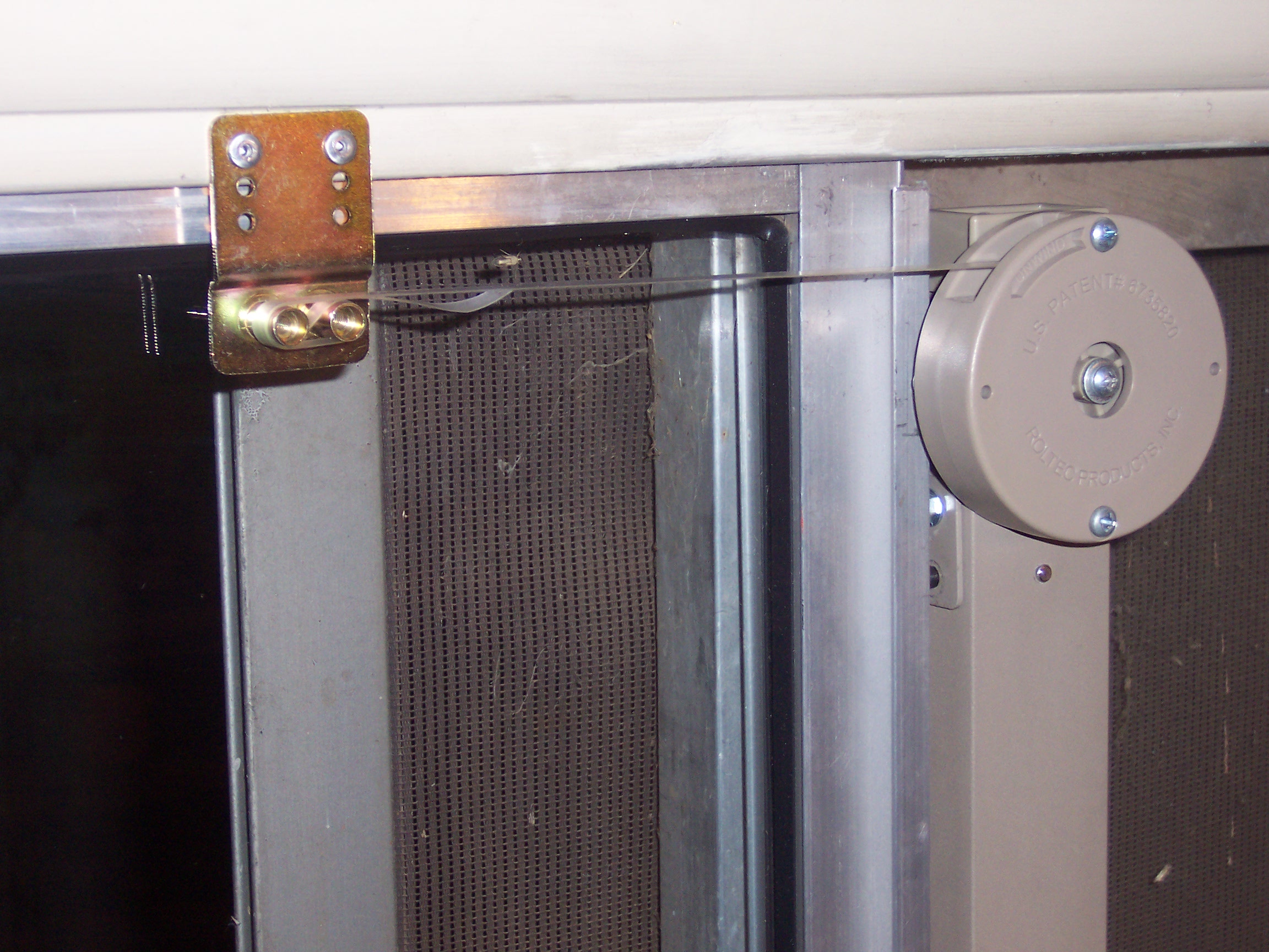 The KLOZIT Strap-Actuated Sliding Glass Door Closer uses 1 roller and an internal stainless steel cable and a gas piston to make a block-and-tackle system which winds up a polyester strap on an external spool. The closer mounts with brackets onto the side of the sliding glass door. The external spool protrudes 1 inch past the face of the door. The strap is connected to an anchor bracket which is mounted to the front of the door frame with two pop-rivets. When the door is opened, the strap unwinds from the spool and winds up the internal cable, compressing the gas piston. When the door is released, the gas piston extends and winds the strap back into the spool, pulling the door closed. The closer can be changed in the field for use on either a right-opening or left opening door. The Strap-Actuated closer has less internal friction than the cable actuated closer, making the door easier to open.
